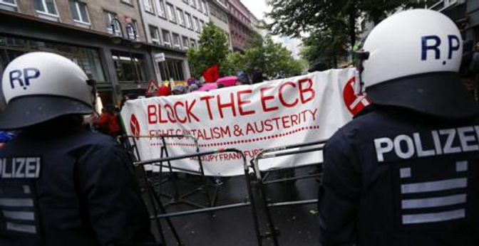 El movimiento europeo Blockupy se inició tras el movimiento Occupy Wall Street en 2011. "La intención de este bloqueo es evitar (que el BCE) opere con normalidad", dijo el portavoz del movimiento Martin Sommer, añadiendo que algunas personas que habían intentado ira a trabajar habían sido enviadas de vuelta por parte de los manifestantes.